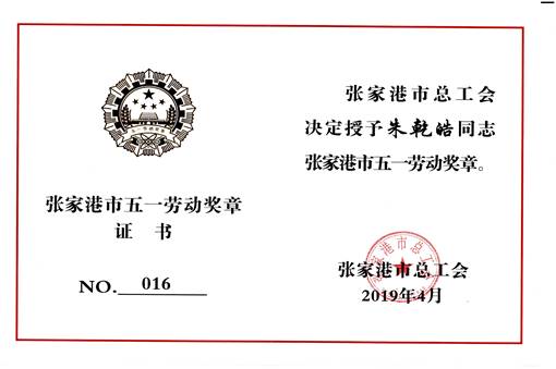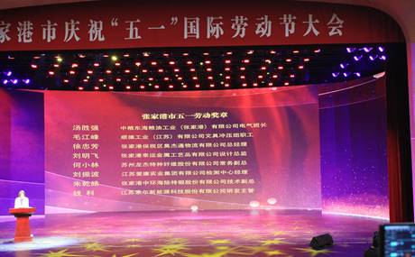 4月30日下午,在新建成的張家港職工文體中心,張家港市總工會舉行了慶祝“五一”國際勞動節大會,表彰了一批先進集體和個人,其中技術副總朱乾皓被授予“張家港市五一勞動獎章”。