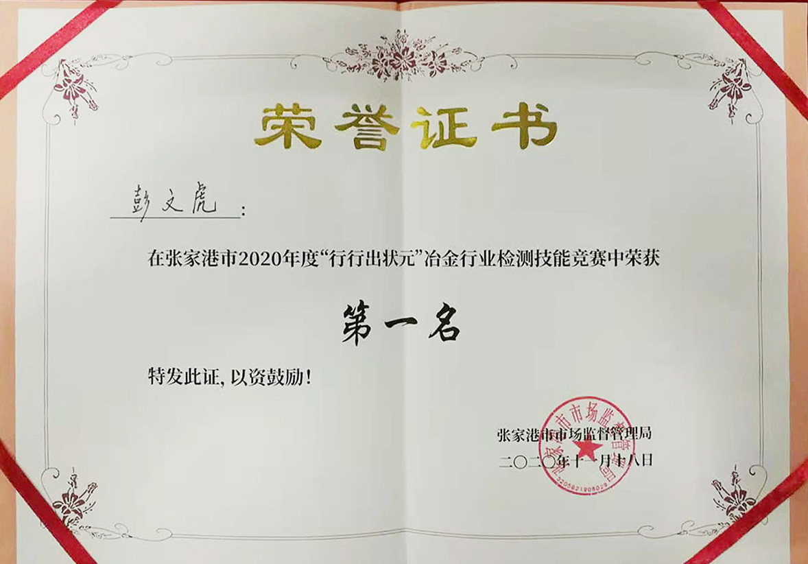 Congratulations to Peng Wenhu for winning the “First Prize” in the Zhangjiagang Metallurgical Industry Testing Skills Competition